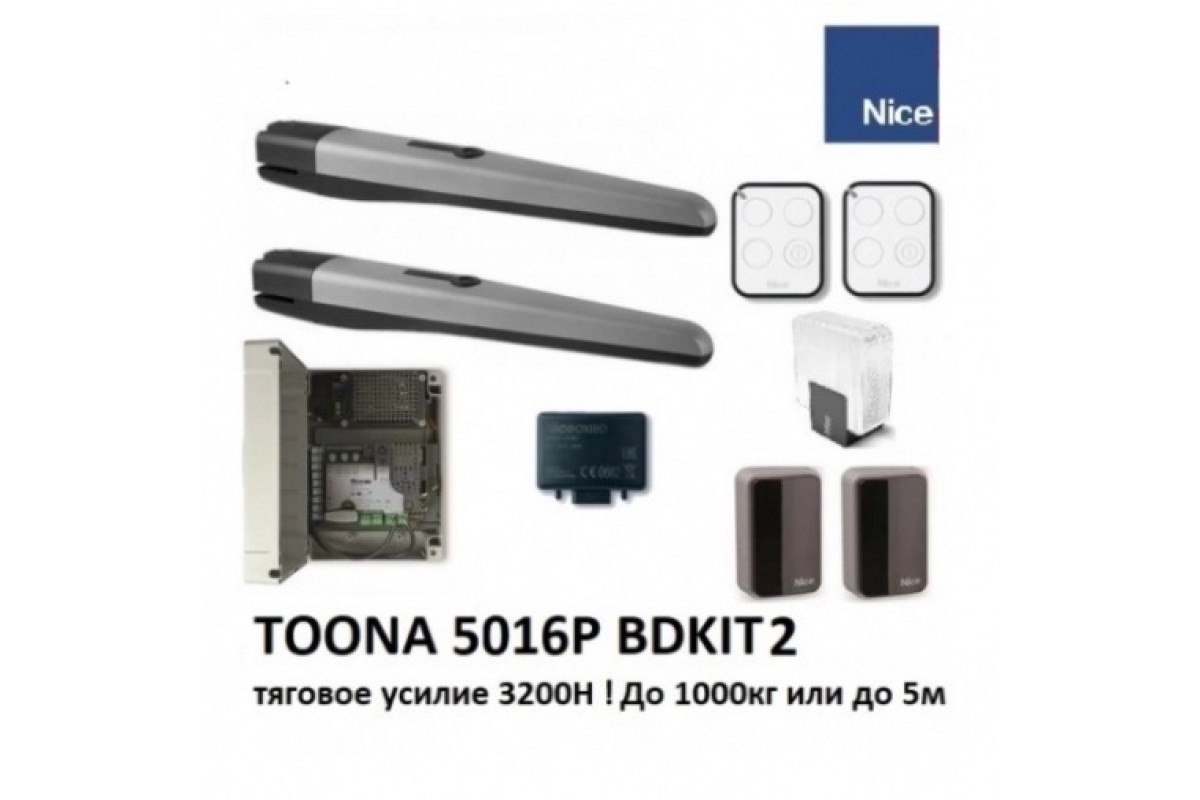 Комплект автоматики для распашных ворот NICE TO5016PKIT2 - подойдет для распашных ворот с шириной створки до 5 метров и массой створки до 1000 кг. Комплект, включающий в себя помимо приводов, блока управления, также пару пультов дистанционного управления и радиоприемник. Относится к автоматике для распашных ворот линейного типа. Питание двигателей 230В. Мощная автоматика для мест с сильной ветровой нагрузкой на створки. Самый высокий показатель тягового усилия на рынке - 3200Н. Подключение к стандартной электросети.