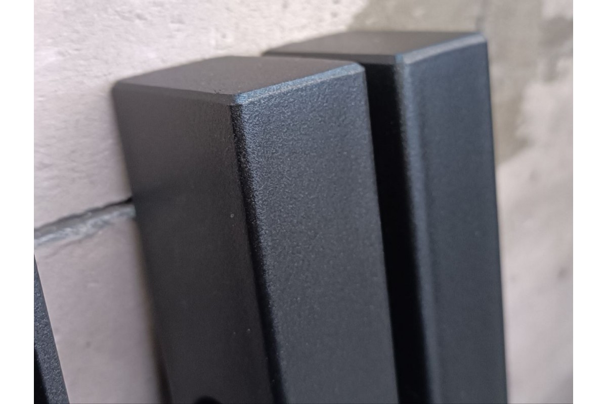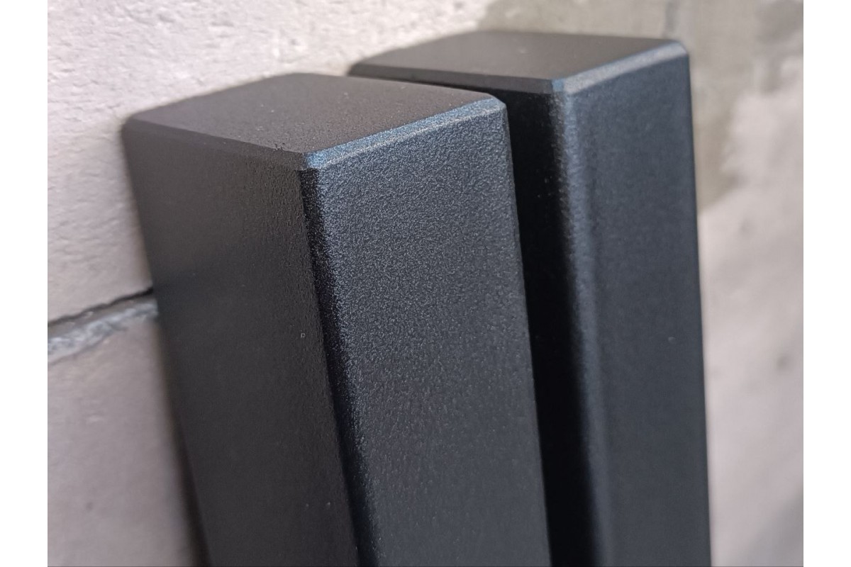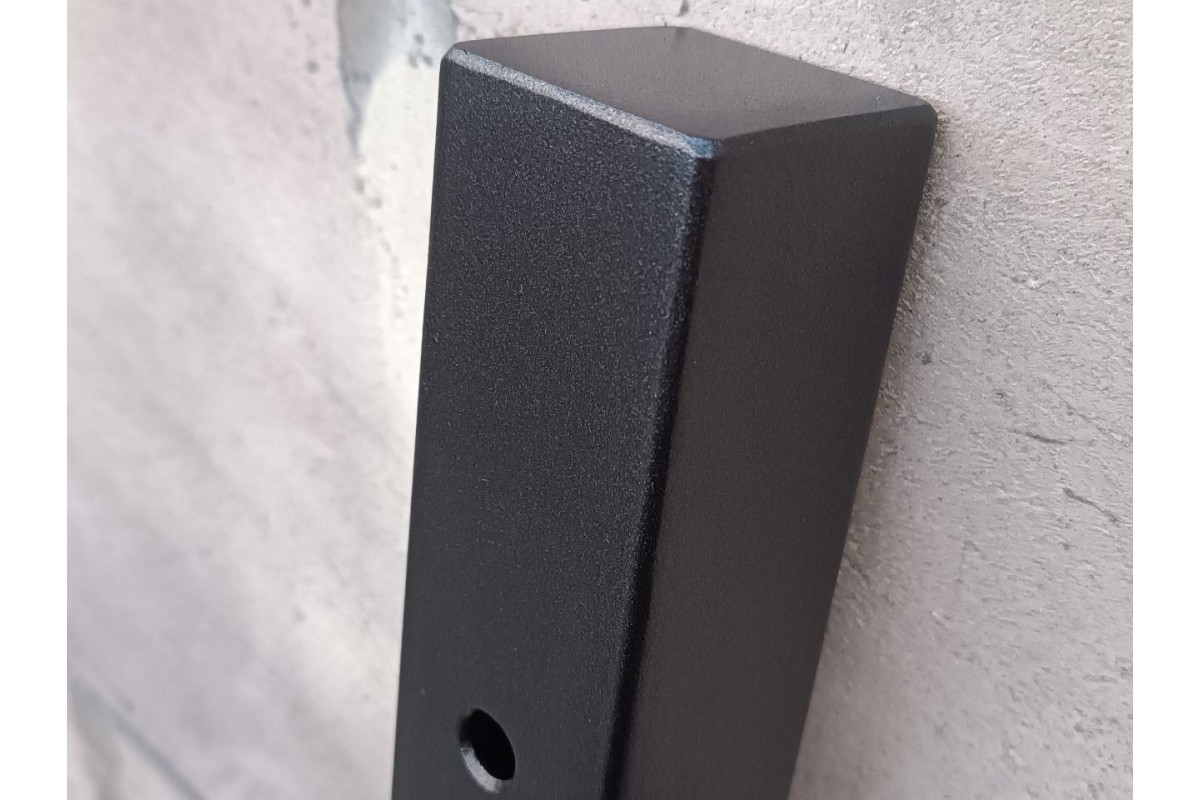 Накладной металлический столб изготавливается из профильной трубы размерами 60х60х2 мм и длиной до 2 -х метров, к нему приварена полоса 4х40 мм, которая выполняет функцию нащельника, оба конца столба заварены металлической заглушкой, снизу просверлено дренажное отверстие для предотвращения конденсата и образования влаги, столб загрунтован.